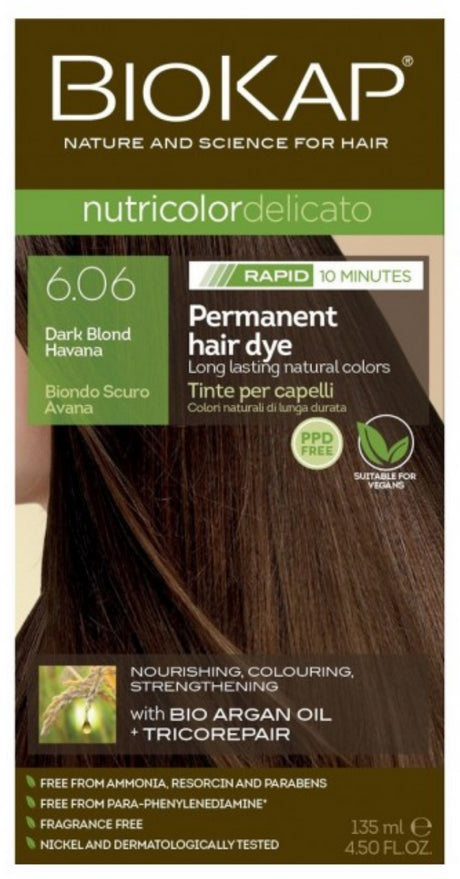 1151€1379€Precio unitario /AgotadoBiokap Nutricolor Delicato 6.06 Rubio Oscuro Habana · Biokap · 140 ml
