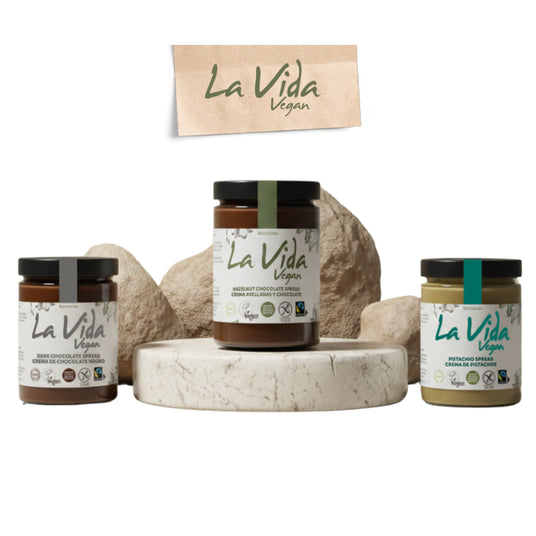 Descubre La Vida Vegan, cremas de chocolate 100% ecológicas, veganas, de comercio justo, elaboradas con aceite de girasol, sin gluten y envasadas en fantásticos tarros de cristal reciclable.