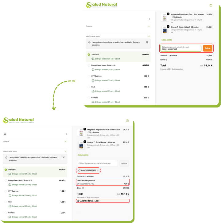 Si dispones de un cupón descuento y has olvidado aplicarlo en tu pedido, ponte en contacto con nuestro equipo de soporte a través del email info@herbolariosaludnatural.com o el formulario de contacto y haremos las gestiones para generar el reembolso del valor del cupón.