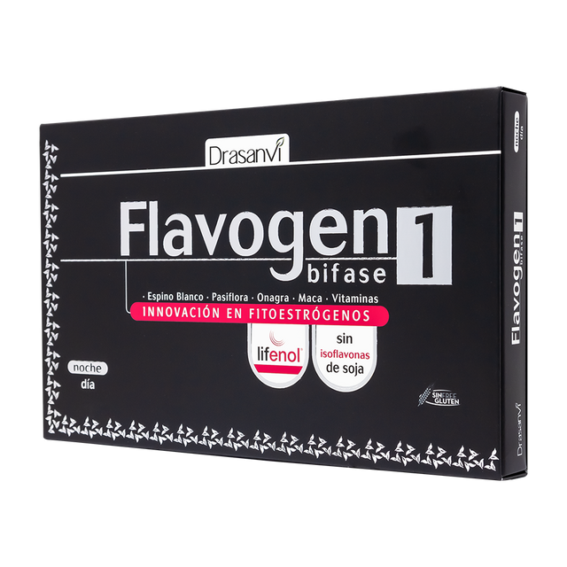 Flavogen Bifase es un complemento de doble acción. Por la mañana se toma la pastilla color rosa, que aporta Lifenol® junto con otros componentes que permiten obtener un aporte extra de vitalidad. Además aporta calcio y minerales que previenen de la descalcificación propia de esta etapa. Por la noche se toma la pastilla azul, que aporta Lifenol® junto con espino blanco y pasiflora para garantizar un adecuado descanso nocturno.
