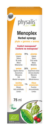 La menopausia es un periodo de transición natural en la vida de toda mujer, que se produce generalmente entre los 45 y 55 años. Algunas mujeres sufren por ello pequeños desarreglos muy molestos, como sofocos, irritabilidad, agitación, … Physalis Menoplex ha sido formulado con el fin de ayudar a las mujeres a atravesar más tranquilamente este delicado periodo. Este complexe contiene lúpulo y salvia que contribuyen al confort de la mujer durante la menopausia. La maca aporta resistencia y vitalidad mientras que el té verde y la milenrama contribuyen al control de peso.