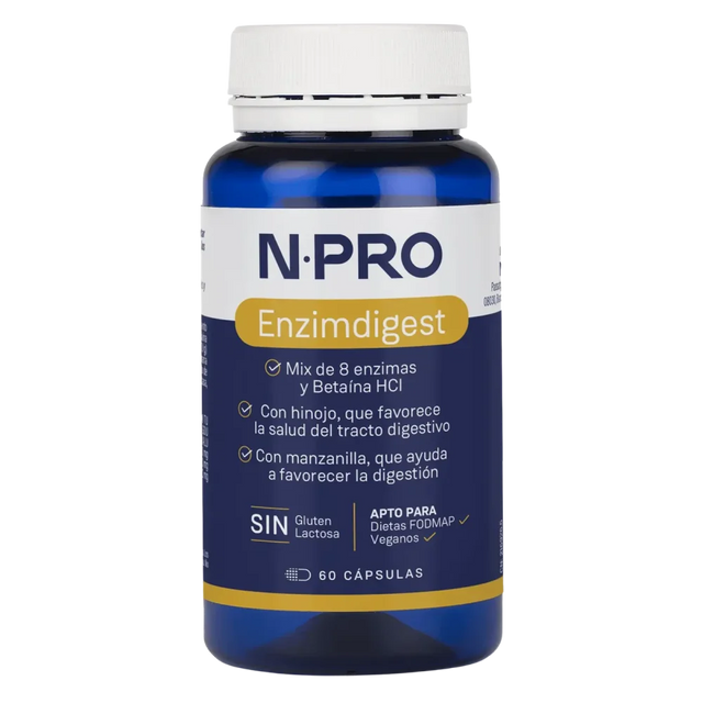 NPro Enzimdigest está formulado con enzimas de procedencia vegetal y fermentativa, que favorecen la correcta asimilación de carbohidratos, grasas y proteínas. Además contiene Betaína HCI natural, que colabora en la absorción de vitaminas y minerales promoviendo el PH correcto del estómago y tracto intestinal para una mejor digestión.
