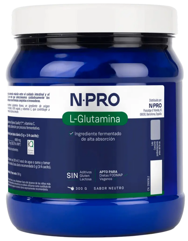 Además NPro L-Glutamina está formulado con ingredientes de alta calidad. Con una L-Glutamina de alta absorción a nivel intestinal por su origen fermentativo y 100% vegetal (Kyowa Quality).