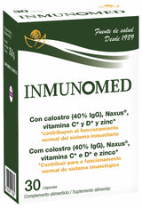 InmunoMed contiene calostro, Naxus®, vitamina C y D y zinc. El Naxus® es un arabinoxilano del trigo, con efecto prebiótico, que apoya tanto la inmunidad innata como la adquirida, mejorando la comunicación de las células del sistema inmunitario e induciendo una mayor respuesta de los anticuerpos. La vitamina C y D y el zinc contribuyen al funcionamiento normal del sistema inmunitario.