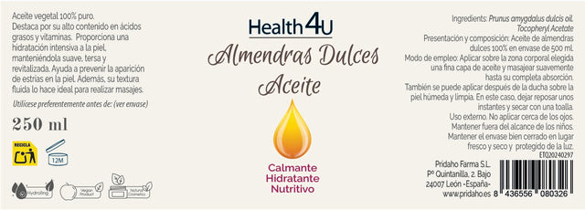 El aceite de almendras posee un alto contenido en ácidos grasos mono-insaturados. Actúa como emoliente, ya que posee propiedades suavizantes y aporta elasticidad a la piel.