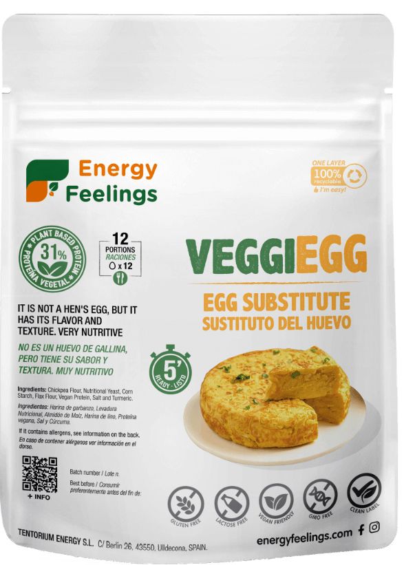 El preparado en polvo Veggieeg Eco de Energy Feelings sustitutivo vegano del huevo puede ser usado en muy diversas aplicaciones y formatos: tortillas vegetales (patata, cebolla, …), revueltos, rebozados, pastelería, etc.