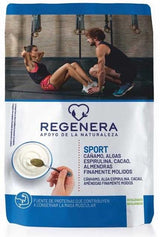 Regenera - Sport de Biover es una mezcla a base de ingredientes 100% naturales con cáñamo, alga espirulina, cacao y almendras molidas en polvo, una gran fuente de proteínas que contribuyen a conservar la masa muscular.