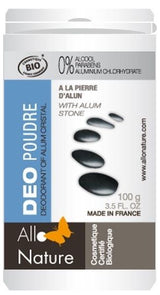 Desodorante de Alumbre en Polvo de Allo Nature es un producto que gracias a su envase específico permite una aplicación sobre los pies y los pliegues del cuerpo evitando así las irritaciones. Práctico y fácil de transportar, no pegajoso, no deja ninguna marca sobre la ropa.