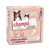 Champú sólido a base de ingredientes naturales para perros y gatos, con avena, caléndula, aceite de argán, manteca de karité, caolín y aceites de oliva, coco y girasol. Sin perfume. Sin sustancias tóxicas. Apto para todas las edades, y razas.