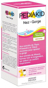 Pediakid® Garganta Nariz utiliza la sinergia de los ingredientes activos naturales más eficaces para luchar contra los resfriados y aliviar el tracto respiratorio (nariz, garganta, pulmones ...), a la primera señal de congestión o irritación.