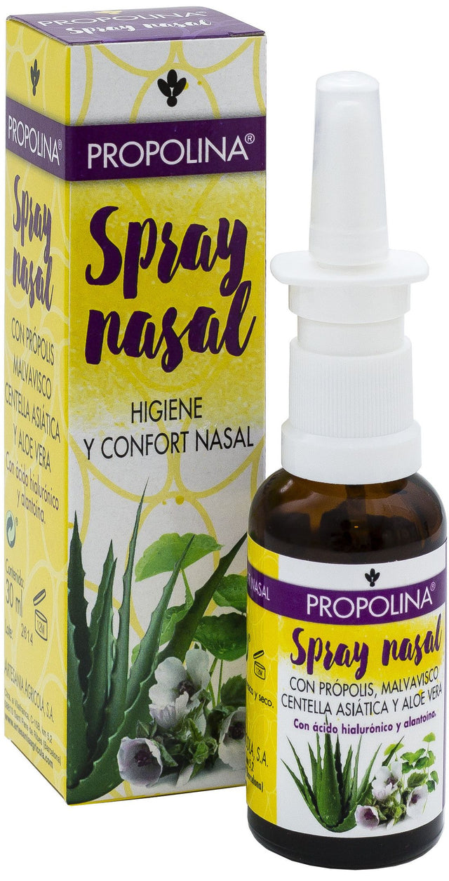 Spray nasal con Própolis, Malvavisco, Centella asiática, Aloe vera, ácido hialurónico y alantoína, formulado para aliviar, hidratar y despejar la nariz taponada. Limpia y purifica las vías nasales sin provocar irritaciones.