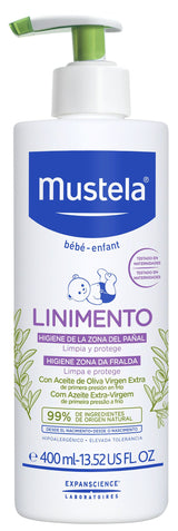 El linimento de Mustela limpia suavemente el culito del bebé desde su nacimiento. También protege su piel de los daños causados por la humedad y el roce de los pañales.