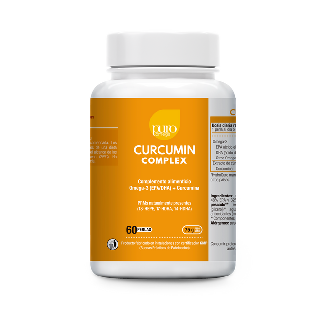 La fórmula Puro Omega Curcumin Complex ofrece una sinergia preventiva y terapéutica que combina los efectos antiinflamatorios del Omega-3 (EPA y DHA) con la gran eficacia antioxidante y antiinflamatoria de la curcumina.