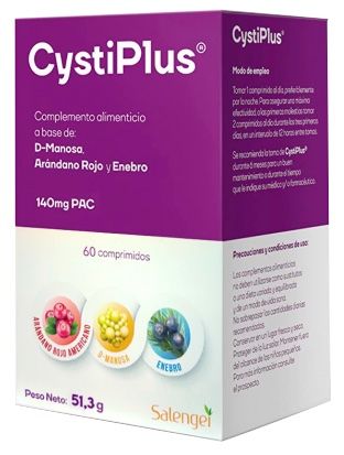 Cystiplus de Salengei es un complemento alimenticio a base de arándano rojo 140 mg PAC (proantocianidinas), D-manosa, y enebro para el bienestar urinario. Gracias a sus ingredientes de origen natural Cystiplus® aporta la máxima prevención gracias a su fórmula de triple acción, con una concentración eficiente que actúa de forma sinérgica para prevenir e inhibir la adhesión de las bacterias a las mucosas y células uroteliales.