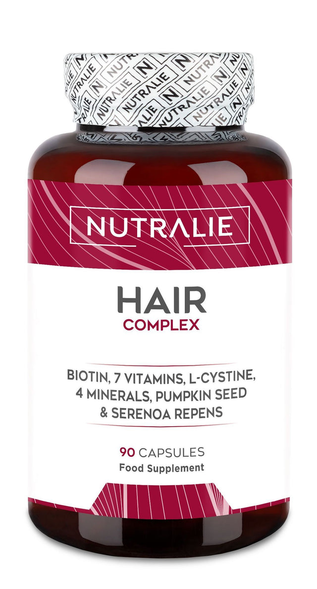 Hair Complex está formulado a base de L-Cistina, Biotina, Selenio, Zinc, Cobre, Semillas de Calabaza y Serenoa Serrulata. Una fórmula compleja con una alta combinación de vitaminas, minerales y extractos naturales que ha sido diseñada para aportar los nutrientes necesarios para fortalecer el cabello dándole un mayor volumen y brillo, así como facilitando el crecimiento de un cabello sano y fuerte.