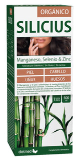 Silicius Orgánico de DietMed es un complemento alimenticio con una fórmula enriquecida con Manganeso, Selenio y Zinc, contribuye a una correcta mineralización ósea, frenar el envejecimiento cutáneo, mejorar el cabello y las uñas y favorecer la salud cardiovascular.