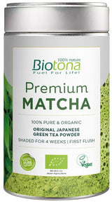 Té Premium Matcha de Biotona es un té verde jade refinado de Japón con un sutil sabor “umami”. Se produce exclusivamente a partir de hojas jóvenes de té que, según la tradición, se cosechan a mano a principios de mayo (en la primera cosecha) después de sombrear los arbustos durante 4 semanas.