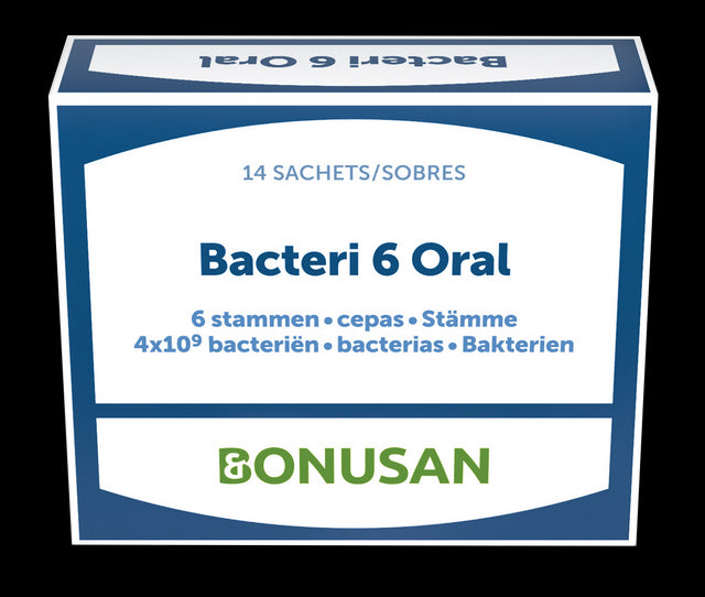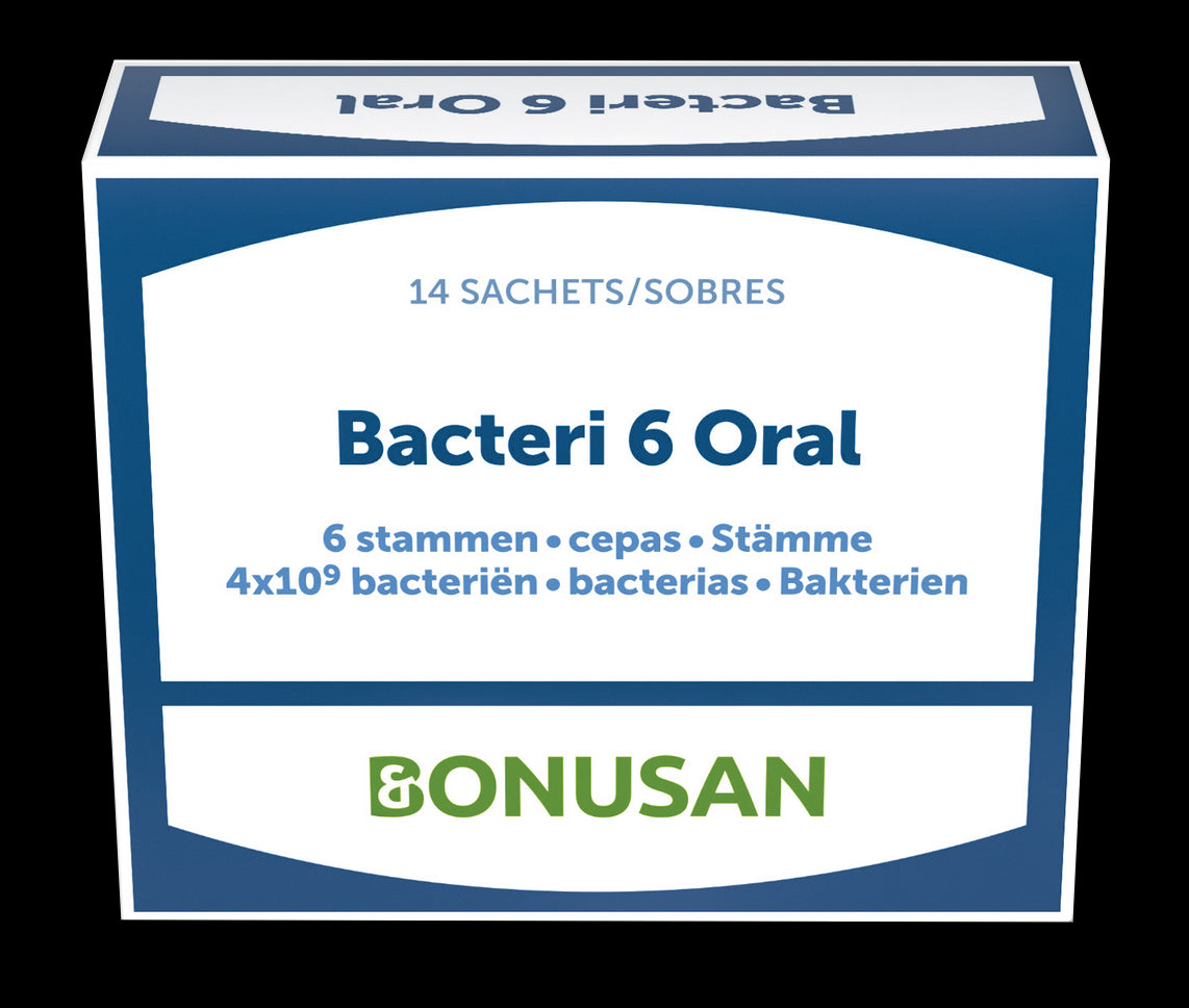 La boca contiene al menos setecientas cepas bacterianas distintas. Bacteri 6 Oral es un suplemento con bacterias para uso oral. Este producto aporta una variada mezcla de seis cepas bacterianas especialmente seleccionadas que reviven de inmediato al usarlo. Bacteri 6 Oral de Bonusan se utiliza durante dos semanas para completar las poblaciones de bacterias que están presentes por naturaleza en la boca.