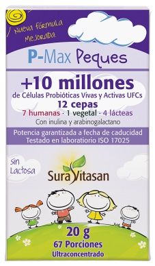 P-Max Peques es una fórmula ultraconcentrada y avanzada de 12 cepas probióticas seleccionadas, F.O.S. (achicoria) y A.O.S. (alerce) para ayudar al equilibrio de la flora intestinal de los más pequeños. Aporta un mínimo de 10.000 millones de bacterias viables de colonización temprana por servicio. Fórmula de fácil administración en polvo para incluir a los alimentos sin modificar el sabor o la textura.