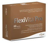 Flexivita PRO es un complemento alimenticio a base de sulfato de glucosamina, sulfato de condroitina, MSM, bambú, cúrcuma, extracto de pimienta negra, manganeso y zinc.