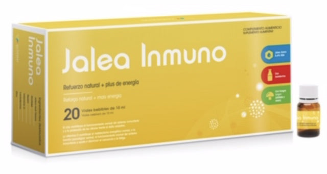 Jalea Inmuno es un producto diseñado para estimular las defensas y tenerlas siempre a punto ante cualquier signo de posible infección. Formulada con ingredientes de reconocida actividad y respuesta inmunitaria, utiliza jalea real con un mínimo de 5,4% de HDA, el cual refleja su calidad y pureza.