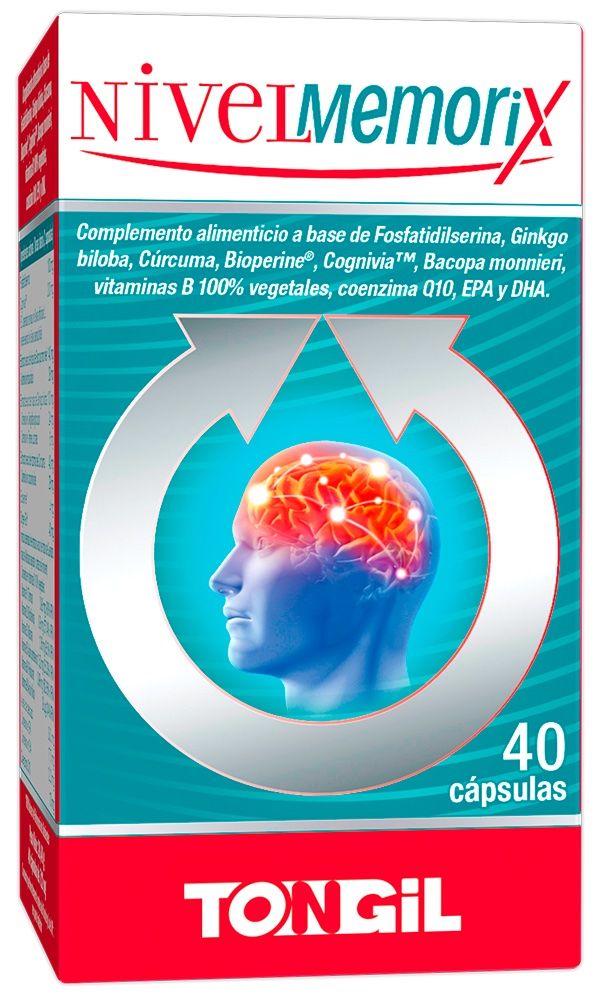 NivelMemorix de Tongil es un complemento alimenticio a base de Fosfatidilserina, Ginkgo biloba, Cúrcuma, Bioperine® , Cognivia™, Bacopa monnieri, vitaminas B 100% vegetales, coenzima Q10, EPA y DHA.