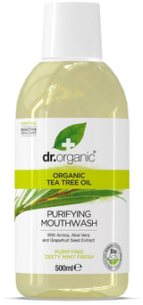 Enjuague bucal antibacteriano que combina las propiedades de limpieza naturales del aceite de árbol de té orgánico, musgo islandés y pomelo con las propiedades calmantes de Aloe Vera orgánica y la centella Asiática. El enjuague de árbol de te Dr. Organic deja la boca fresca y limpia a menta.