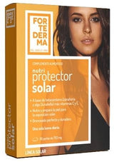El Nutriprotector Solar cuida la piel desde dentro, llegando a zonas donde no podemos aplicar crema solar como es el caso del cuero cabelludo o los ojos. Ayuda a evitar los efectos nocivos de los rayos solares, a reducir el envejecimiento cutáneo y la sensibilidad de la piel a los UV. Su formulación a base de ingredientes naturales prepara la piel para la exposición solar y acelera un bronceado homogéneo, uniforme y más duradero. Es el complemento imprescindible de la fotoprotección tópica que contribuye a proteger la totalidad de la piel y no está sujeto a la forma de aplicación, la eliminación por el agua, el sudor o la reaplicación.