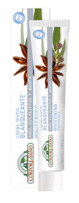 La Crema Dental Blanqueante de Corpore Sano proporciona protección total de la cavidad bucal y a la vez una acción blanqueante. Está elaborada con ingredientes procedentes de cultivos biológicos y con más de un90% de ingredientes naturales. El carbonato de calcio es un agente blanqueante natural que ayuda a eliminar el sarro, a remover la placa, la suciedad y las manchas. Además es un agente limpiador suave que evita dañar el esmalte. Los extractos vegetales ayudan a prevenir los problemas bucales y proporcionan a esta crema un aroma fresco y muy agradable.