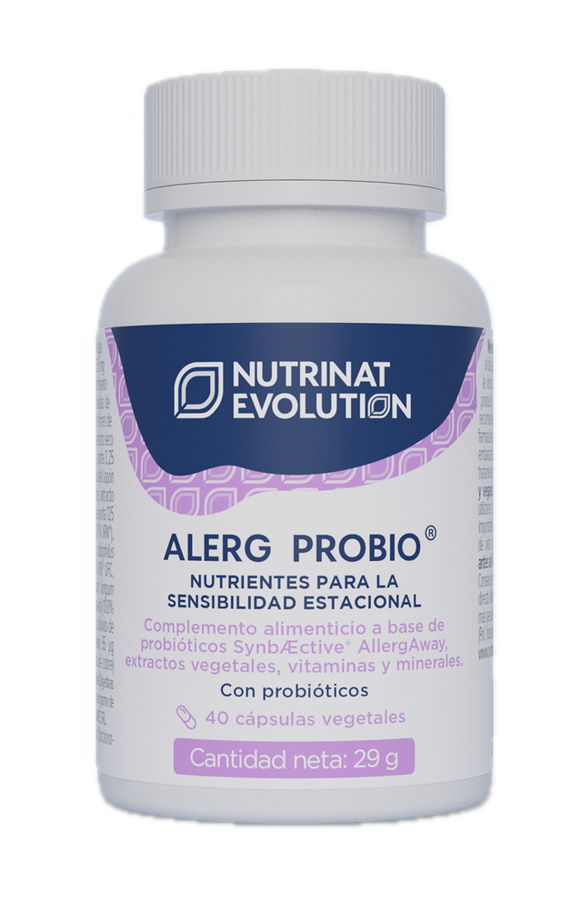 Alerg Probio de Nutrinat Evolution es un complemento alimenticio formulado para ayudar a reducir los síntomas de las alergias estacionales y fortalecer el sistema inmunológico, combinando extractos vegetales, minerales esenciales, vitamina C y probióticos específicos.