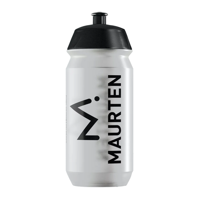 Bidón deportivo de 500 ml con instrucciones para mezclar Maurten Drink Mix. Se adapta a los portabidones estándar de las bicicletas.