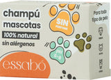 Essabó Champú mascotas es un champú sólido 100% natural ideal para perros, gatos y otro tipo de animales domésticos. Gracias a una formulación rica en carbohidratos, proteínas, sales minerales y vitaminas enriquecida con manteca de mango, aceite de ricino, argán y jojoba, limpia y suaviza el pelo respetando la piel del animal.