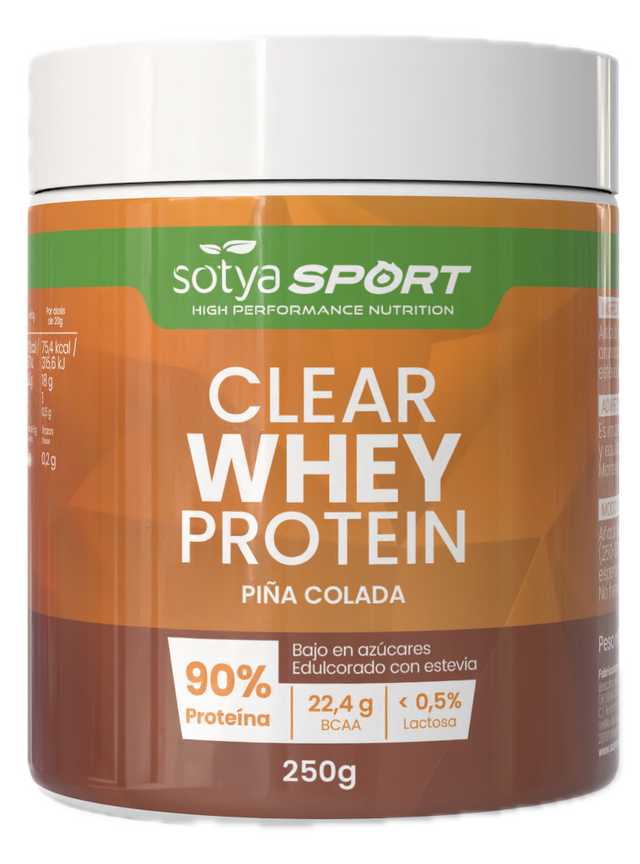 Clear Whey Protein Piña Colada de Sotya es un complemento alimenticio elaborado con aislado de suero de leche, bajo en grasas y azúcares. Aporta un 90% de proteínas de alta calidad y 22,4 g de BCAA por cada 100 g, favoreciendo la recuperación muscular, el desarrollo de masa magra y el rendimiento deportivo, con un refrescante sabor a piña colada. Ideal para deportistas y estilos de vida activos.