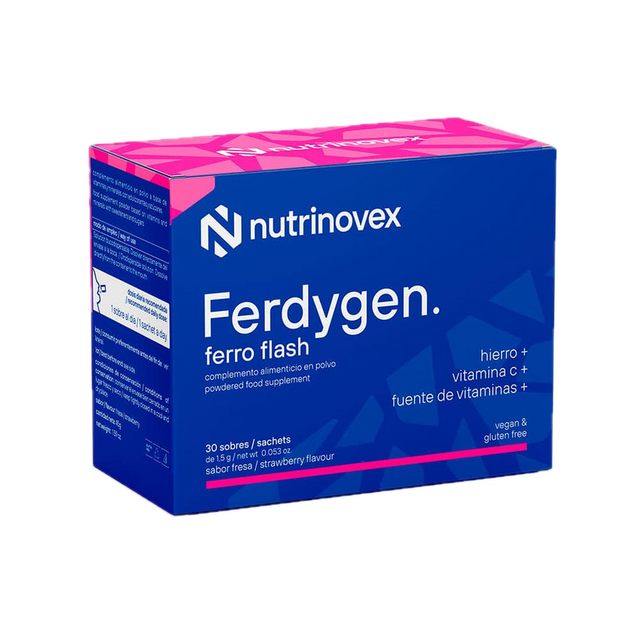Ferdygen Ferro Flash de Nutrinovex es un complemento formulado para prevenir y tratar la deficiencia de hierro de forma eficaz y sin molestias digestivas. Su formato bucodispersable y su combinación con vitaminas del grupo B y vitamina C contribuyen a reducir el cansancio y la fatiga, favorecer la formación normal de glóbulos rojos y mejorar la absorción del hierro, siendo ideal para personas con necesidades aumentadas de este mineral, como deportistas, mujeres o personas con anemia ferropénica.