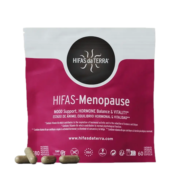 Hifas-Menopause ayuda a nivel psicológico y físico ante los cambios hormonales asociados a la perimenopausia y menopausia. No contiene hormonas ni isoflavonas. Es una fórmula 100% natural con polvo de Melena de león, extractos puros de Reishi, Cordyceps, raíz de Ashwagandha KSM-66 y té verde (con 95% de polifenoles); probióticos; vitaminas (B6 y D) y minerales (zinc). Su composición natural ayuda en el equilibrio hormonal, el estado de ánimo, la perdida de memoria y la vitalidad.