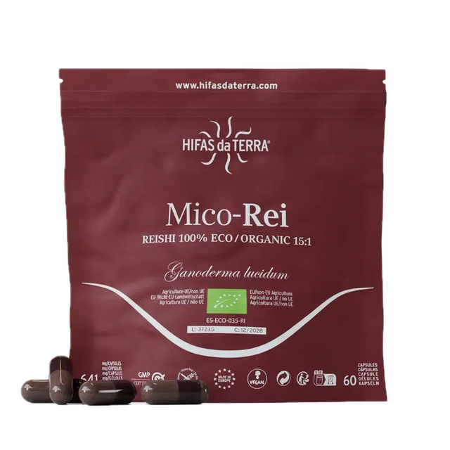 Mico Rei extracto de Reishi es un complemento alimenticio de alta concentración en cápsulas. Solo contiene extracto puro y ecológico de Reishi (Ganoderma lucidum) con un alto contenido de nutrientes como beta-glucanos, triterpenos, fenoles, ergosteroles, etc.